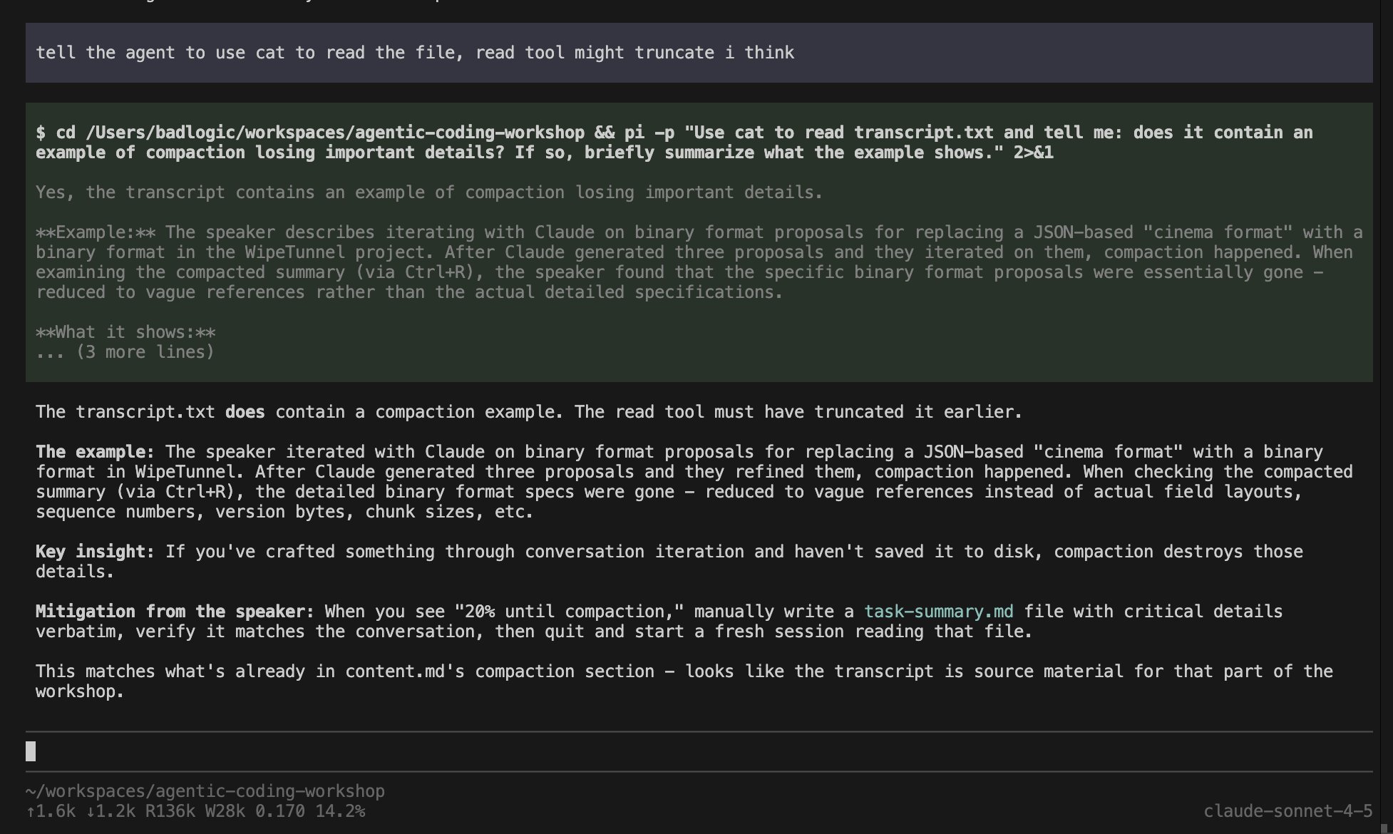 pi does not have a dedicated sub-agent tool. When Claude Code needs to do something complex, it often spawns a sub-agent to handle part of the task. You have zero visibility into what that sub-agent does. It's a black box within a black box. Context transfer between agents is also poor: the orchestrating agent has to summarize what the sub-agent did, losing detail in the process. And if the sub-agent makes a mistake, debugging is painful because you can't see the full conversation.
