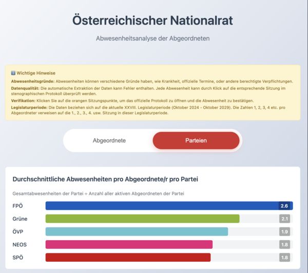 Parliament Watch: @alltagsprolet.at asked me if I could build something to track who's absent from parliament sessions. "Give me 10 minutes," I said. It took 2 hours. The site scrapes stenographic protocols and shows absence rankings by party and individual MPs.