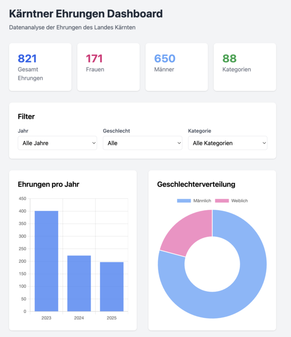 Carinthian Honors Dashboard: Kathrin Stainer-Hämmerle posted that Carinthia awards about 50 state honors per year but claims they can't determine how many go to women. Armin Wolf suggested someone count them manually. I used Sitegeist to scrape 3 years of honors data and had an LLM classify gender from names. Built a dashboard in a few hours.