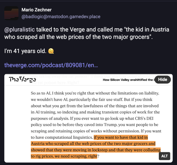 On a fun note, Cory Doctorow talked to The Verge and called me "the kid in Austria who scraped all the web prices of the two major grocers." I'm 41 years old.