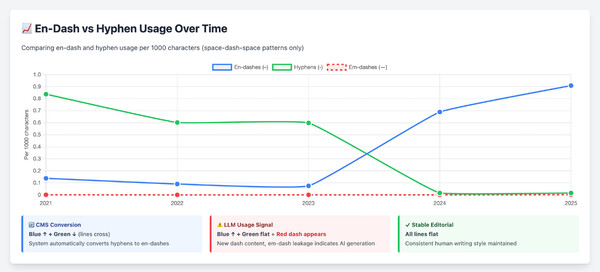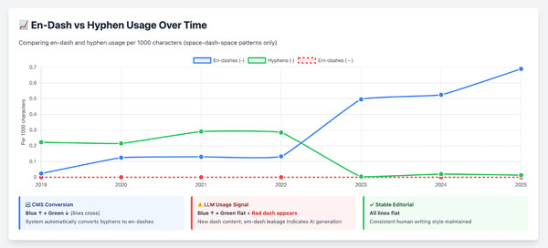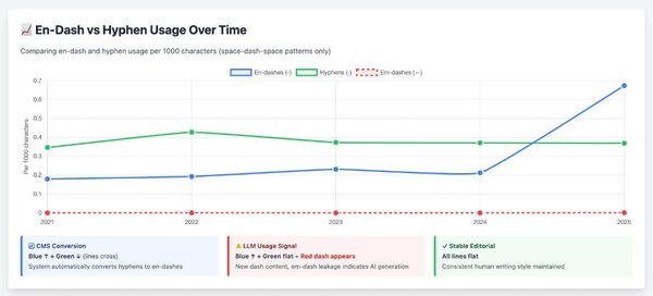 Not necessarily. Many CMS systems auto-convert <space><hyphen><space> to <space><en-dash><space>. So a CMS update could explain the pattern. The solution: differential analysis. If dashes go up while hyphens go down proportionally, that's a CMS doing find-and-replace on existing content. If dashes explode while hyphens stay flat, that's new dash-heavy content being added, which means LLM generation. Falter and Krone showed the CMS pattern: