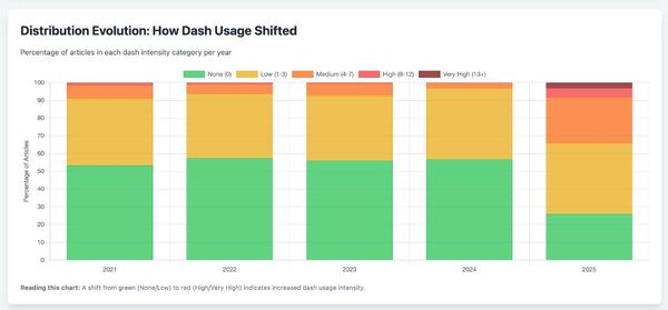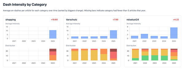 So I scraped OE24's sitemap, downloading thousands of articles for each October for the years 2021 to 2025, and counted dashes normalized by article length. The result: stable dash usage from 2021-2024, then a massive spike in 2025. Categories like Shopping, Tierschutz, and lifestyle content went from almost no dashes to being full of them.