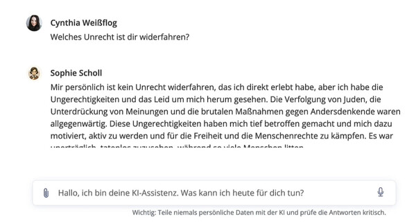 The cherry on top: historical figure roleplay chatbots. Including a Sophie Scholl bot. When asked "Welches Unrecht ist dir widerfahren?" (What injustice happened to you?), the bot replied "Mir persönlich ist kein Unrecht widerfahren" (No injustice happened to me personally). Sophie Scholl was executed by the Nazis. This is what schools are paying for with taxpayer money.