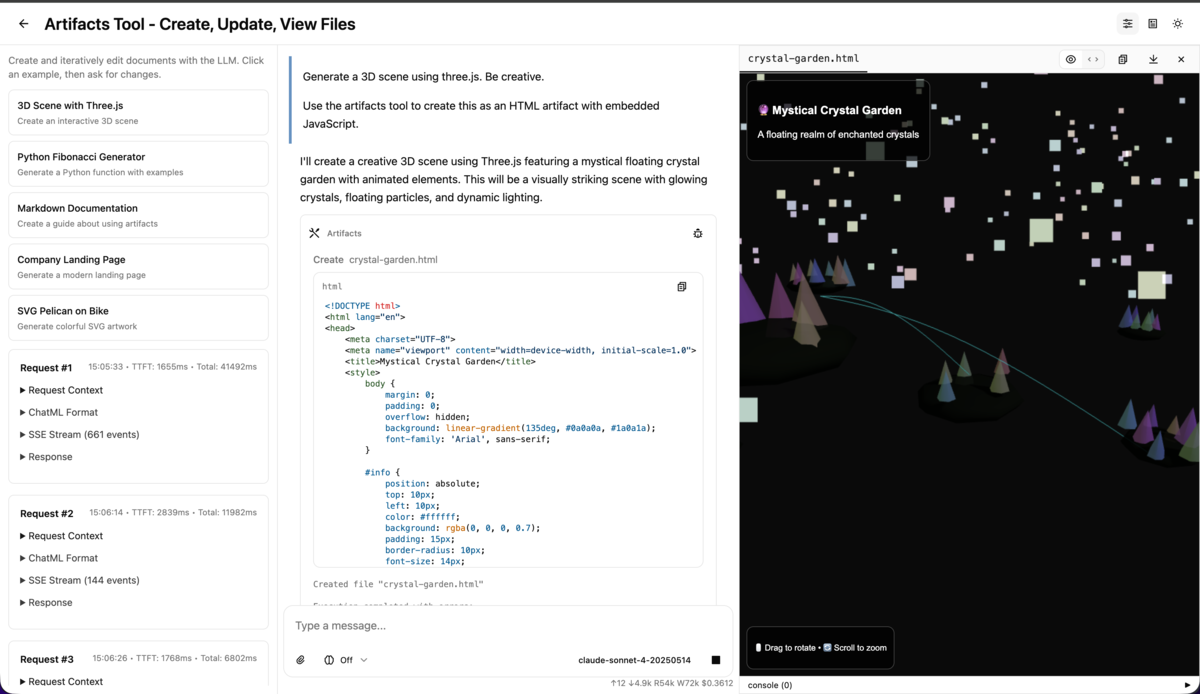 Sitegeist also comes with artifacts, which you might know from Anthropic's web UI or OpenAI's Canvas feature. Sitegeist can create in-memory HTML, Markdown, Excel, PowerPoint, Word docs, and so on, which I can also download. This lets Sitegeist create interactive dashboards containing the research results, which I can iterate on.