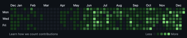 If you have a look at the header image, you will see a bit of a gap for February and March. Reason being: I have become old. I suppose that's the most interesting observation about this year for me. My body is falling apart slowly. I spent some time in the hospital and then needed quite a bit of time to recover, which meant I didn't have the energy outside of family stuff to do anything really. That explains the gap in my GitHub contributions.