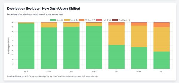 The basic idea was this: LLMs love inserting em-dashes and en-dashes everywhere. The hypothesis is that after the introduction of ChatGPT, (plus some time for the technology to actually reach newsrooms), we would see an increase in em-dash or en-dash use over time. That increase can obviously also be explained by other causes, such as changed style guides, new authors coming into the team, or changes in the CMS. But given enough data, we might be able to differentiate between these causes.