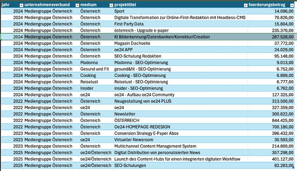Austrian newspapers are heavily subsidized, both with government ads and direct funding. One of these funding programs is called "Fonds Digitale Transformation," where newspapers can hand in shoddy project descriptions that lay out digitalization efforts, for which they then get thousands to hundreds of thousands of euros. Most of these projects are just bullshit. So when I saw Commander Raika's screenshot, I thought this is a good time to investigate how this money is spent. Here's a table for OE24 showing some of their funded "Digital Transformation" projects.