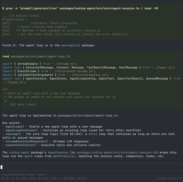 I've written extensively about how and why I built pi in What I learned building a minimal LLM coding agent, so I won't repeat all of that here. Since I wrote that blog post, pi has seen a lot of third-party contributions from really nice people.