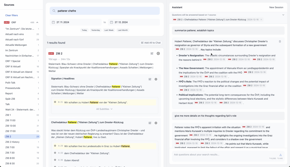 WaveMind: I started scraping Austrian audio news sources and transcribing them with AI. It began with Falter Radio, where I transcribed all 437 episodes going back to 2023. Then I added Ö1 Journale, ORF TV news, Dunkelkammer, and some other podcasts. Everything is searchable on transcript level, behind closed doors. Closed doors because I don't want to get sued by the biggest Austrian broadcaster. It's not just a transcript search engine. It also allows you to stuff search results into the context of Gemini and then interrogate the transcripts via LLM. I did give access to a couple of journalists. They found it mildly useful.